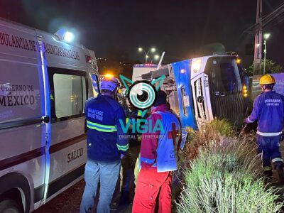 Vuelca camión de Qrobus por choque en Paseo de la República