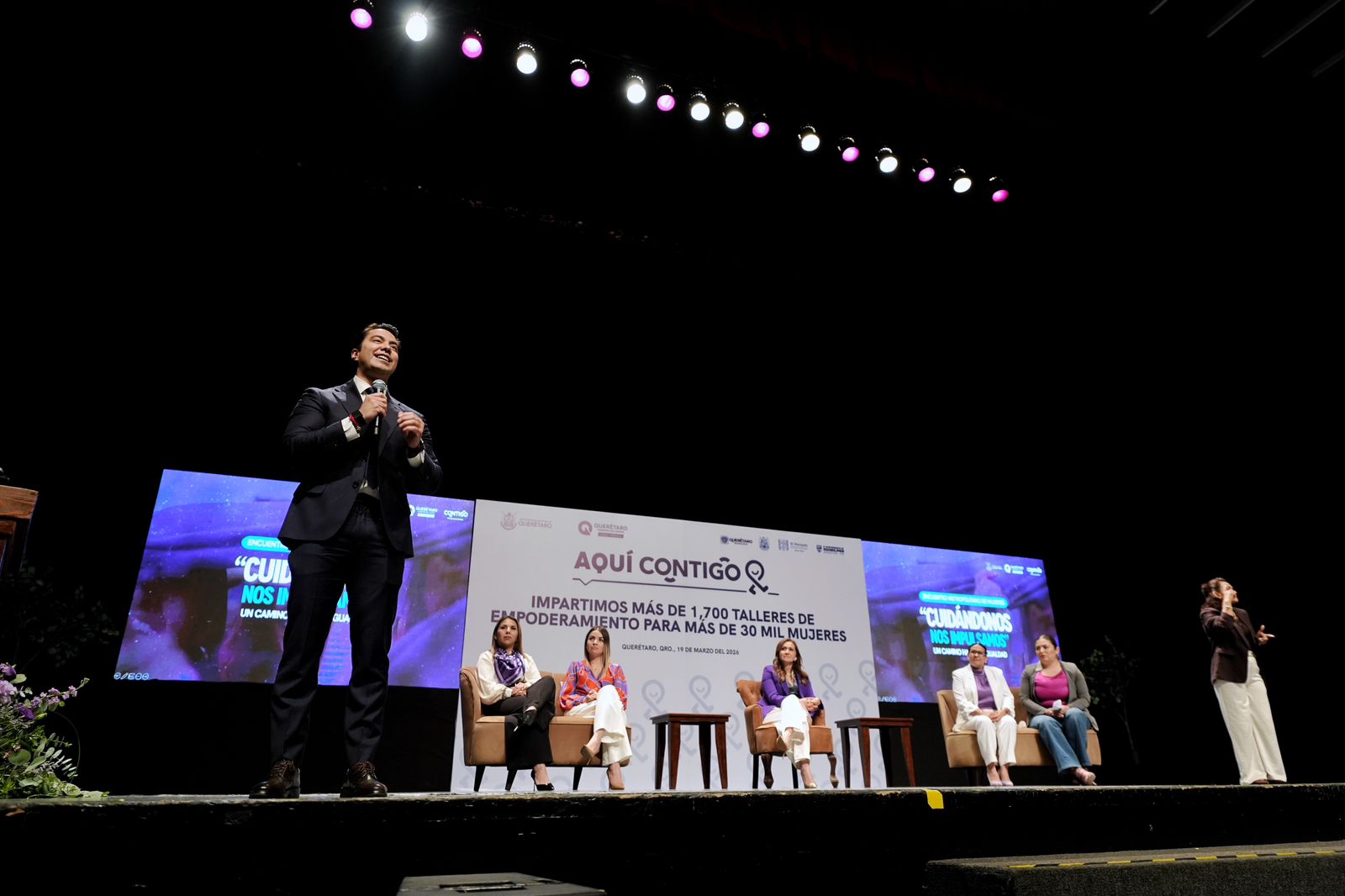 Querétaro, Qro., jueves 19 de marzo del 2026.- El presidente municipal de Querétaro, Felifer Macías, acudió a la inauguración del panel “Cuidándonos, Nos Impulsamos: Un camino hacia la igualdad”, organizado por la Secretaría de la Mujer del Estado, donde reconoció el trabajo de las mujeres queretanas y la importancia de generar políticas públicas que impulsen su desarrollo y bienestar.