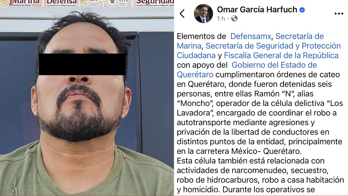 “En Querétaro se cumplimentaron órdenes de cateo donde fueron detenidas seis personas, entre ellas Ramón ‘N’, alias ‘Moncho’, operador de la célula delictiva ‘Los Lavadora’, encargado de coordinar el robo a autotransporte mediante agresiones y privación de la libertad de conductores en distintos puntos de la entidad”, señaló el funcionario federal.