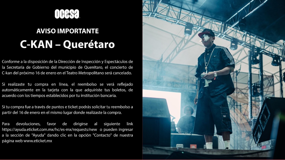 Querétaro, Qro., martes 13  de enero del 2026.- A través de un comunicado oficial, el Municipio de Querétaro informó la cancelación del concierto del cantante C-Kan, programado para el viernes 16 de enero de 2026 en el Teatro Metropolitano, al determinar que el evento incumplía con el Reglamento de Espectáculos vigente.