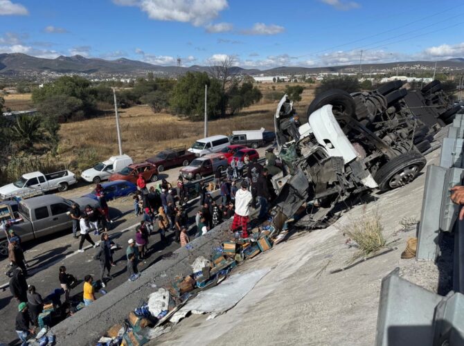 Local Municipios Querétaro Vuelca tráiler cargado con suavizantes en trébol de autopista 57 y carretera San Miguel Allende /30 Dic 2025/Rafael Vigil/Comments are Off