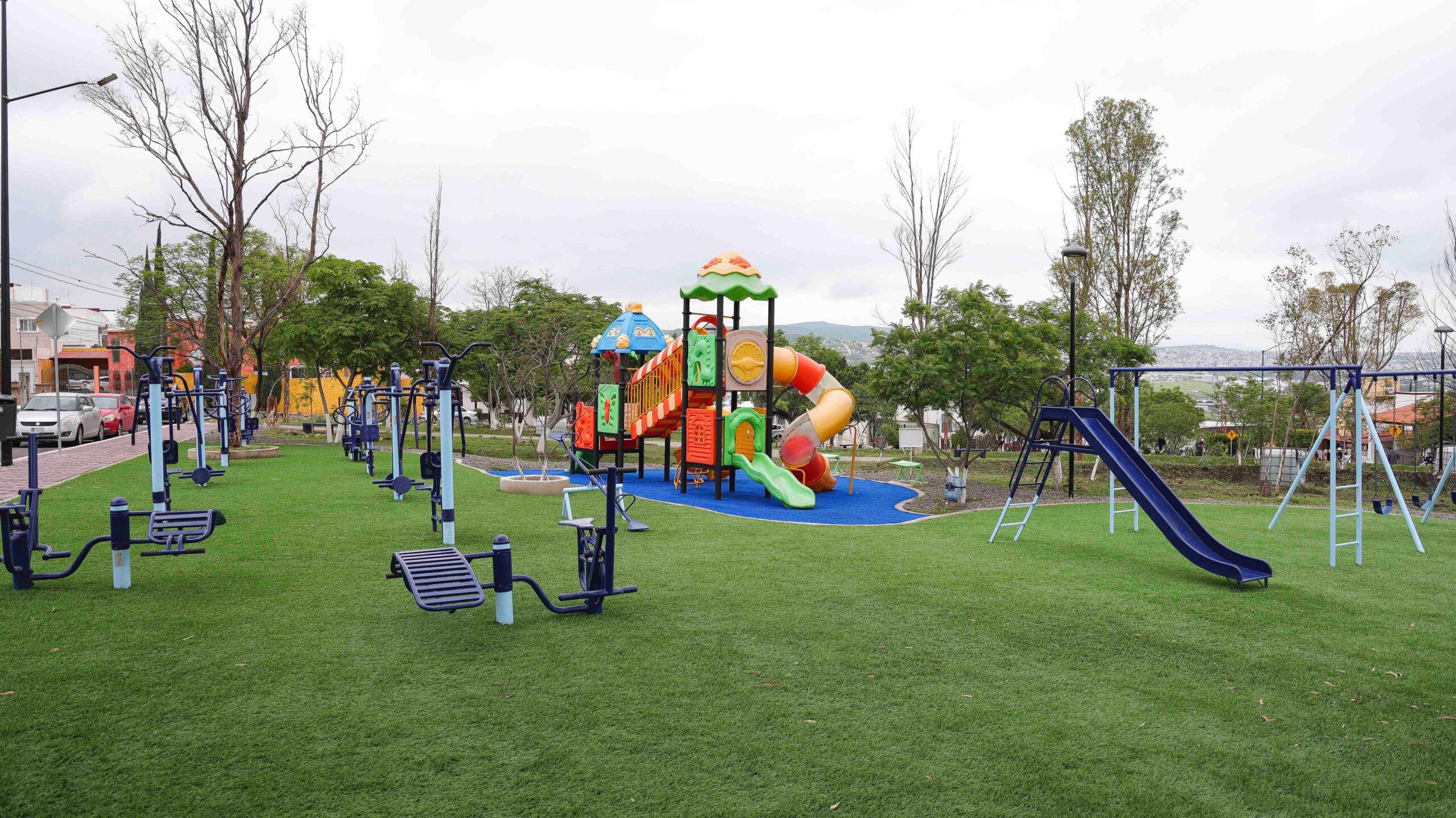 Se construyeron 487 metros lineales de andadores, nueva plaza central, áreas de gimnasio, juegos infantiles y alumbrado renovado, todo respetando los árboles existentes.
