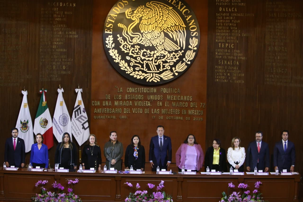 Querétaro ,Qro., sábado 18 de octubre del 2025.- El Instituto Electoral del Estado de Querétaro (IEEQ) y el Tribunal Electoral del Poder Judicial de la Federación (TEPJF), a través de la Dirección General de Igualdad de Derechos y Paridad de Género, presentaron “La Constitución Política de los Estados Unidos Mexicanos con una Mirada Violeta”, en el marco del 72 Aniversario del voto de las Mujeres en México.