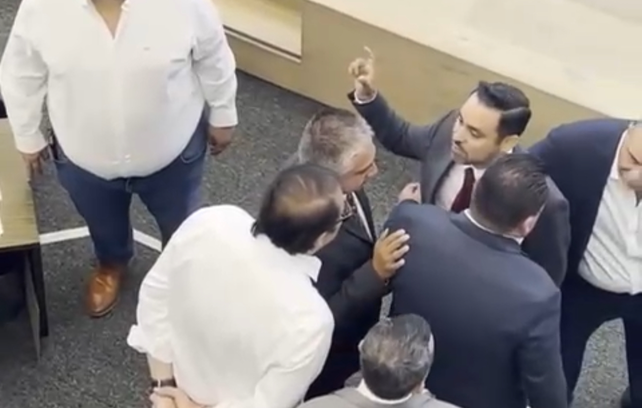 Querétaro, Qro., jueves 28 de agosto del 2025.- Los legisladores Homero Barrera de Morena de Morena y Guillermo Vega del PAN tuvieron un conato de enfrentamiento en el pleno del Congreso Local debido a señalamientos realizados, el conato fue previo al inicio de la sesión donde el morenista expuso la guerra de declaraciones.