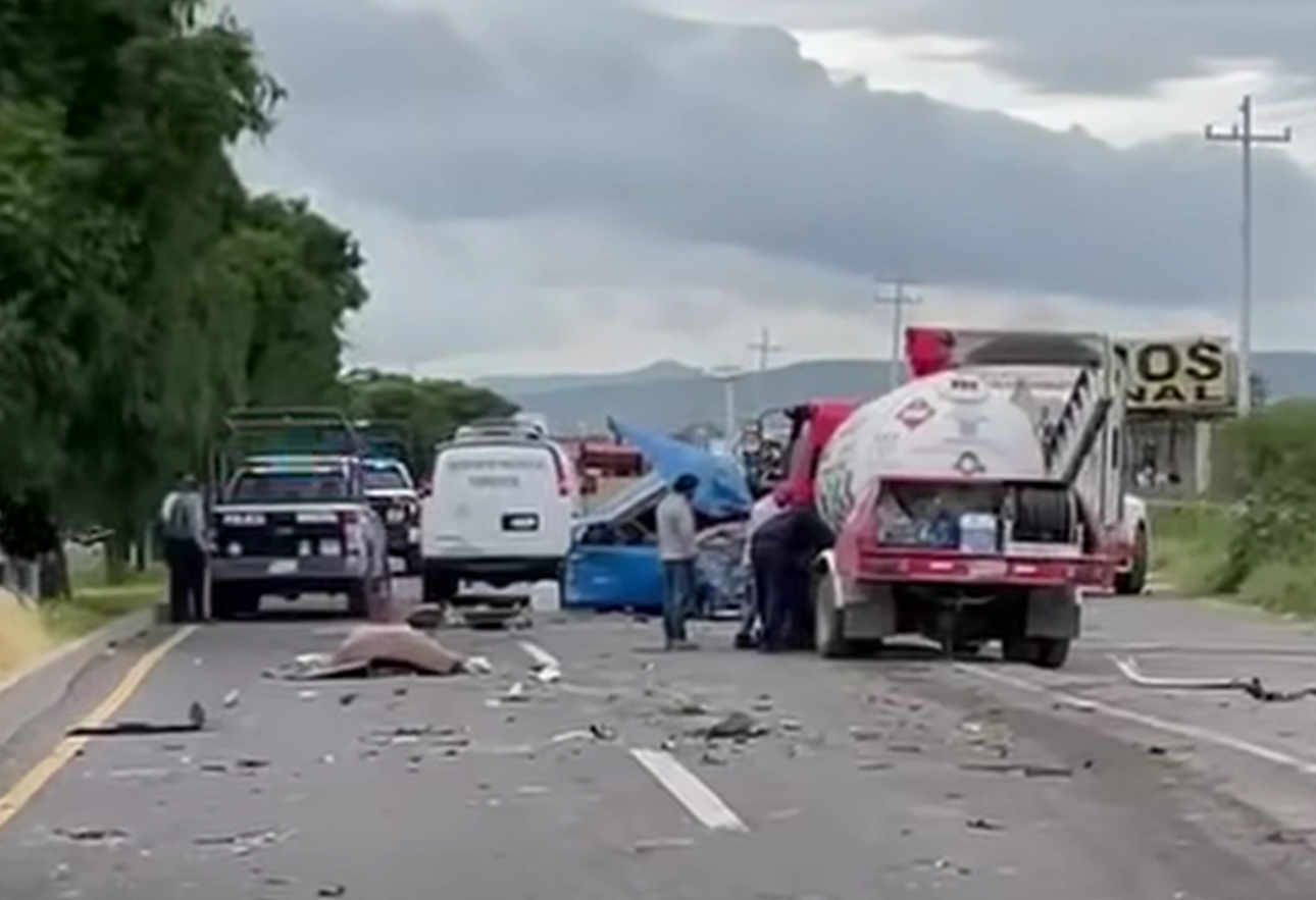El accidente se registró cuando el conductor de un auto tipo Mustang modelo antiguo en color azul perdió el control, cuando circulaba en dirección a la carretera 57 a exceso de velocidad, lo que provocó que invadiera los carriles de contraflujo donde impactó una camioneta la cual volcó y después estrelló de frente contra un camión repartidor de gas LP.