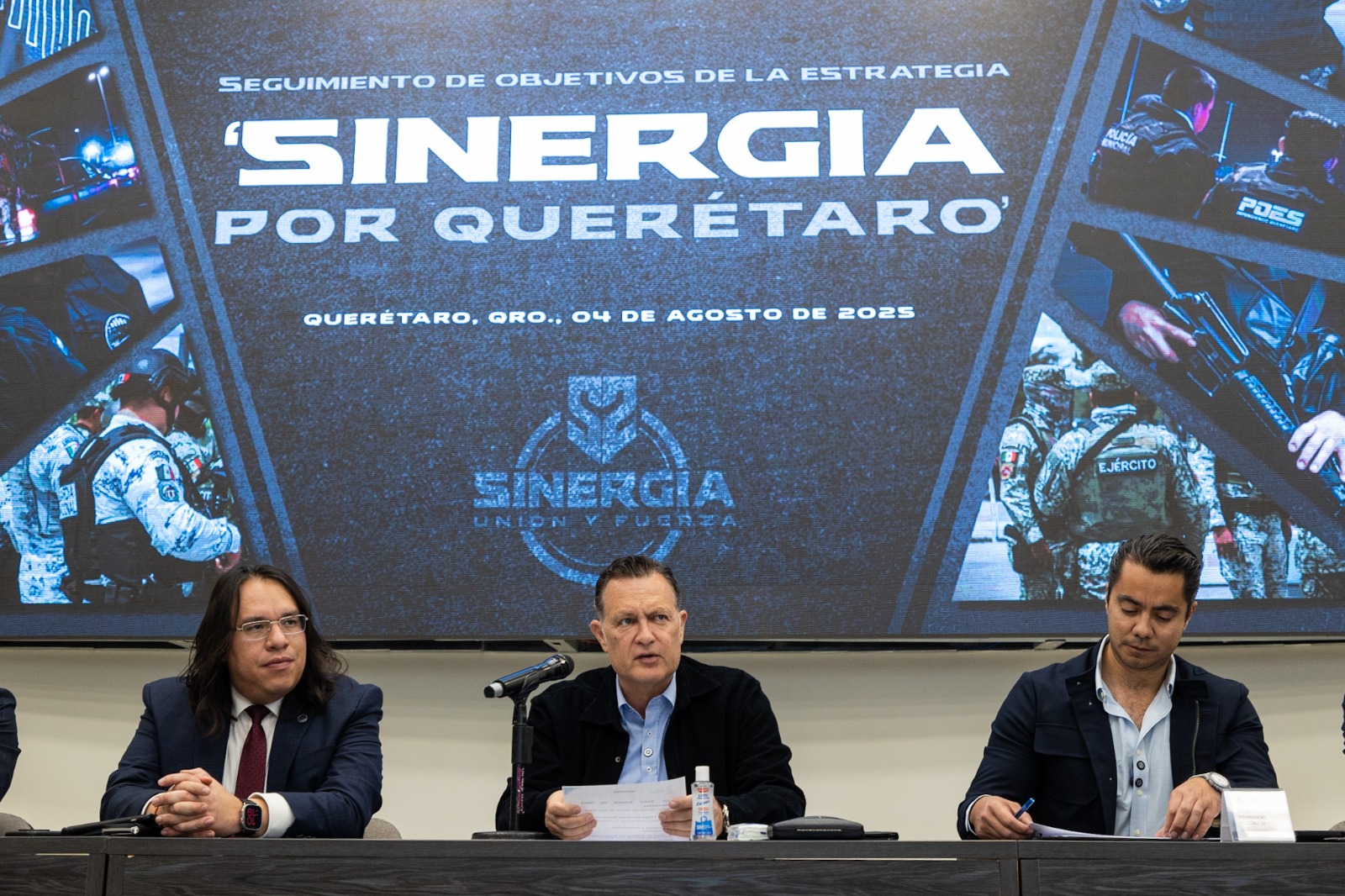 Querétaro, Qro., lunes 4 de agosto del 2025.- El titular del Poder Ejecutivo estatal, Mauricio Kuri González, asistió a la reunión de seguimiento de objetivos de la estrategia “Sinergia por Querétaro”, la cual tiene como propósito fortalecer la coordinación y colaboración entre las distintas corporaciones de seguridad de los tres órdenes de gobierno, así como alinear las agendas estratégicas y de mitigación de riesgos.