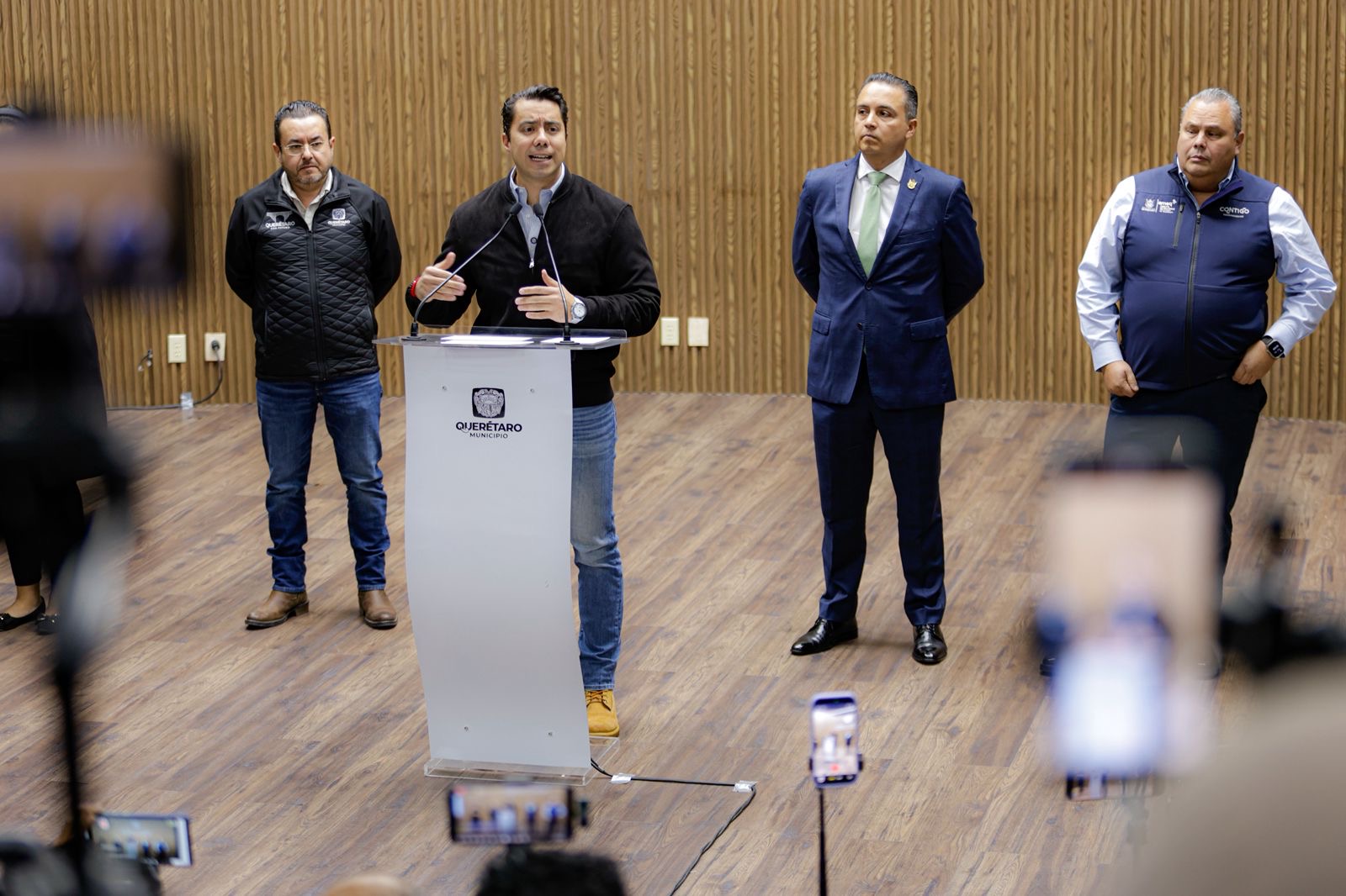 Querétaro, Qro., martes 20 de enero del 2026.- El presidente municipal de Querétaro, Felifer Macías, junto con el secretario de Gobierno, Eric Gudiño Torres; el director de la Agencia de Movilidad del Estado de Querétaro, Gerardo Cuanalo Santos; y el secretario de Movilidad, Pedro Ángeles Luján, dieron a conocer el operativo que se implementará con motivo del inicio de la obra federal del Tren México–Querétaro, con el objetivo de reducir al máximo las afectaciones a las y los habitantes de la capital.