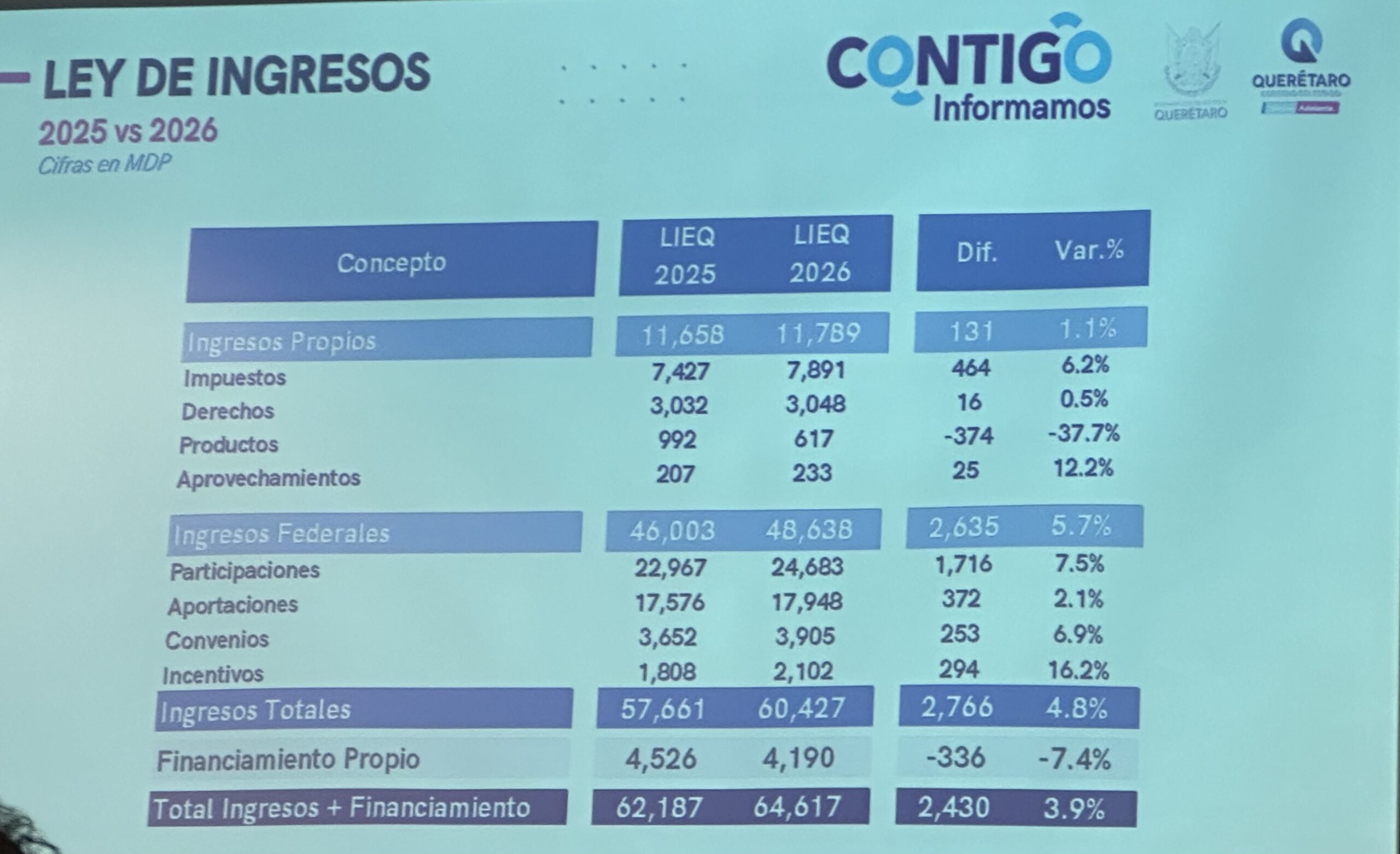 Querétaro ,Qro., lunes 1 de diciembre del 2025.- El gobierno del estado de Querétaro presentó ante el Congreso local el proyecto de Presupuesto de Ingresos para el ejercicio fiscal 2026, por un monto total de 64 mil 617 millones de pesos, lo que representa un crecimiento del 3.9 por ciento* respecto al año anterior.