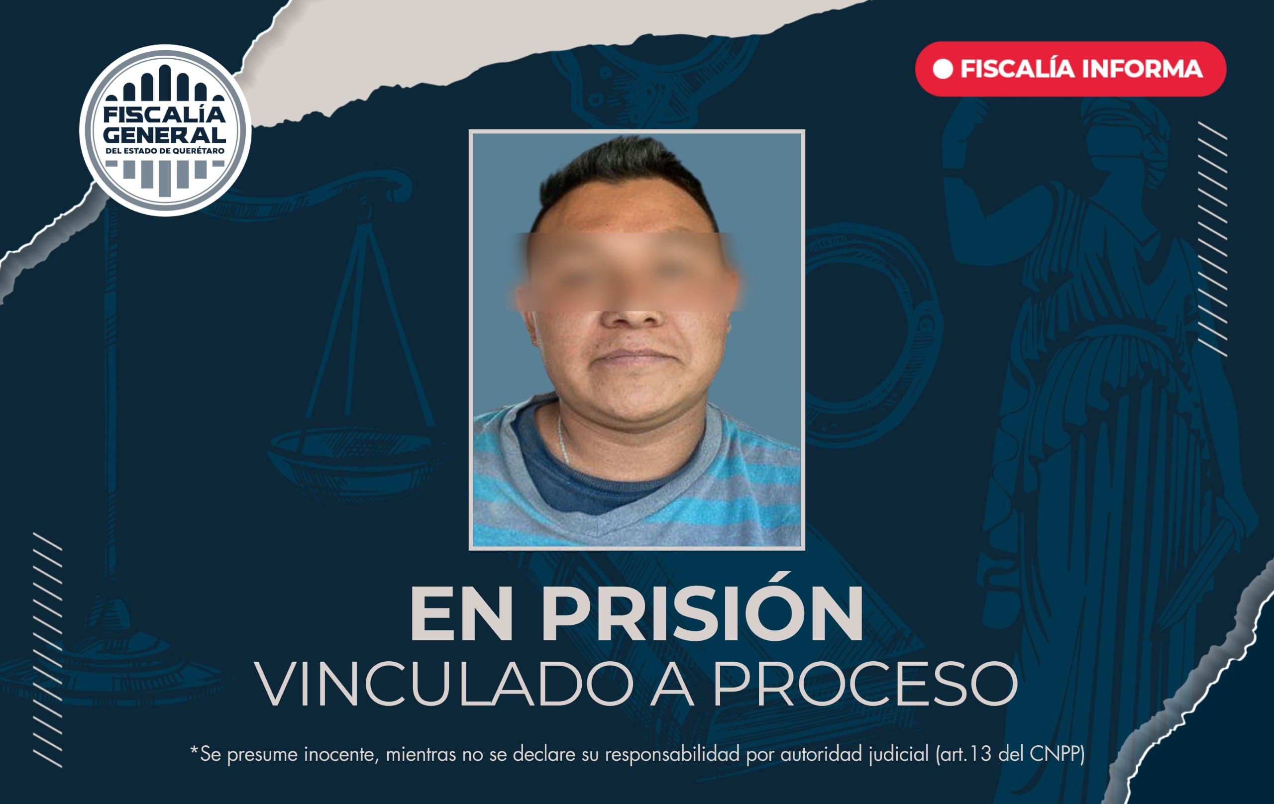 Querétaro ,Qro., miércoles 15 de octubre del 2025.- La Fiscalía General del Estado de Querétaro, obtuvo la vinculación a proceso de un hombre, por su probable autoría en el delito de homicidio calificado.