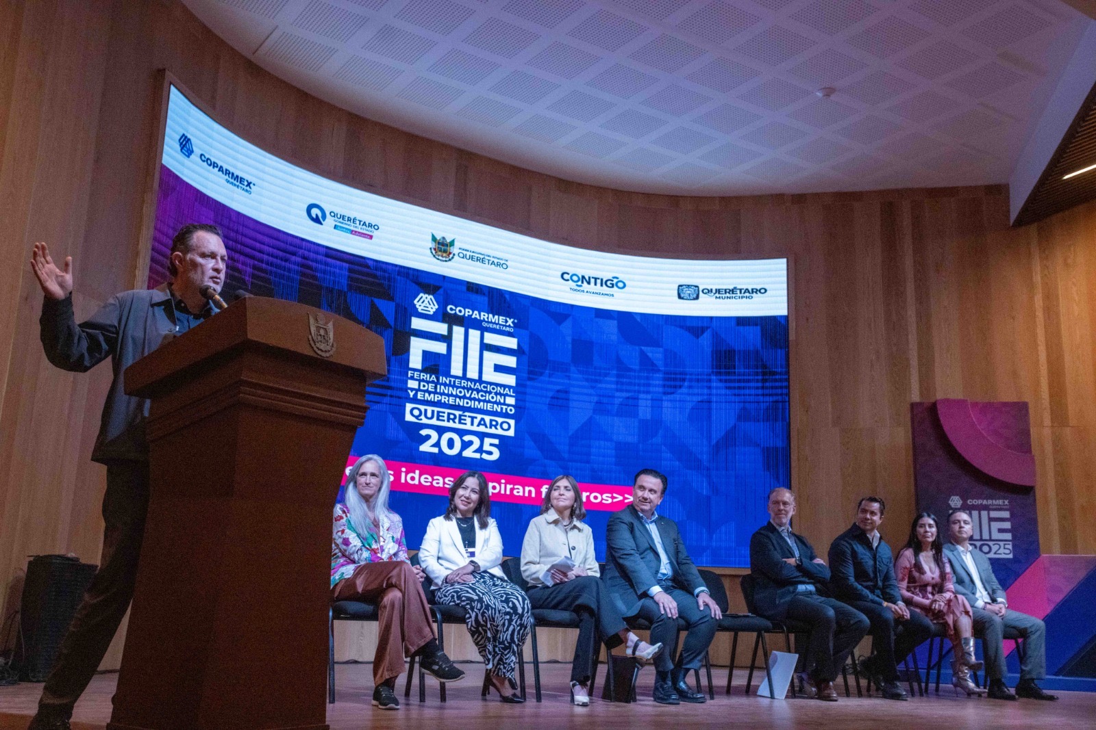 Querétaro, Qro., 17 de septiembre del 2025.– Con la presencia del gobernador del estado, Mauricio Kuri González; del presidente nacional de la Confederación Patronal de la República Mexicana (COPARMEX), Juan José Sierra; y del presidente municipal de Querétaro, Felipe Fernando Macías, arrancó este miércoles la Feria Internacional de Innovación y Emprendimiento (FIIE) Querétaro 2025, organizada por COPARMEX Querétaro en el Centro de Innovación y Tecnología Creativa (BLOQUE).