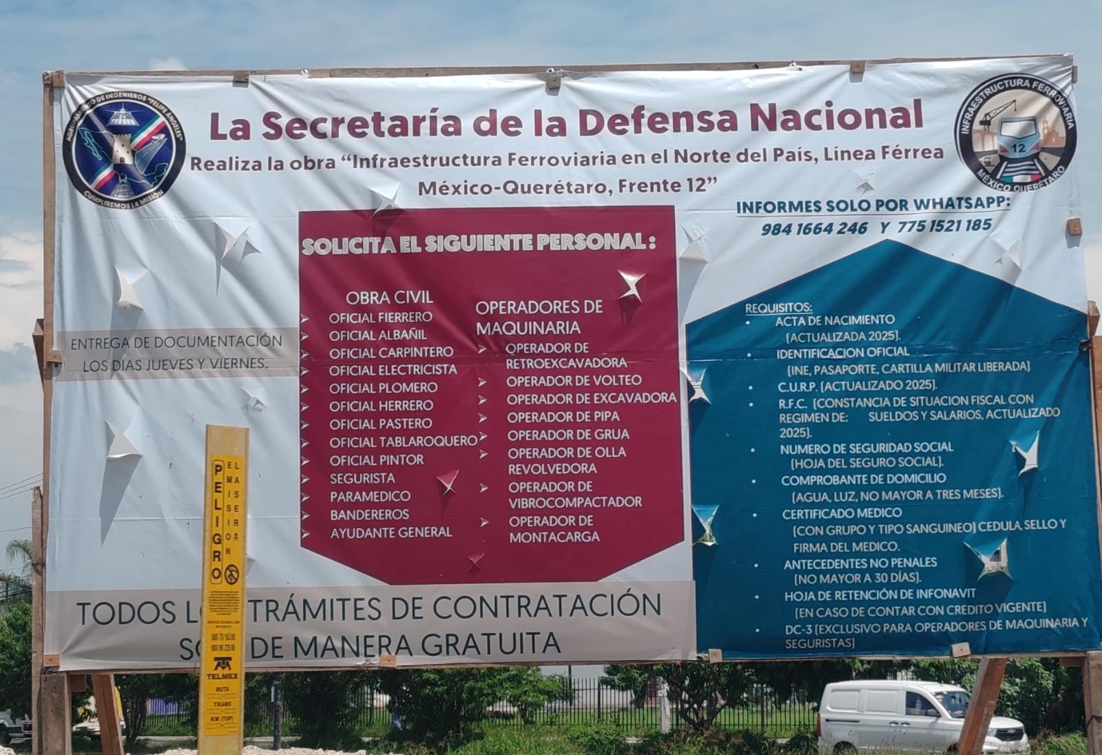 A través de una lona informativa, colocada junto a las vías del tren, en la colonia Los Héroes, municipio de El Marqués, el agrupamiento militar encargado de la obra busca reclutar personal.