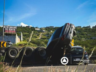 Trailer vuelca y provoca aparatosa volcadura en el Junípero Serra